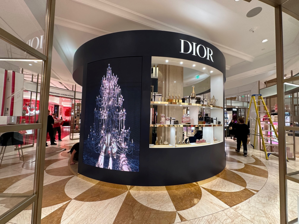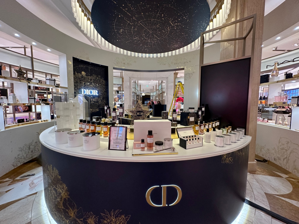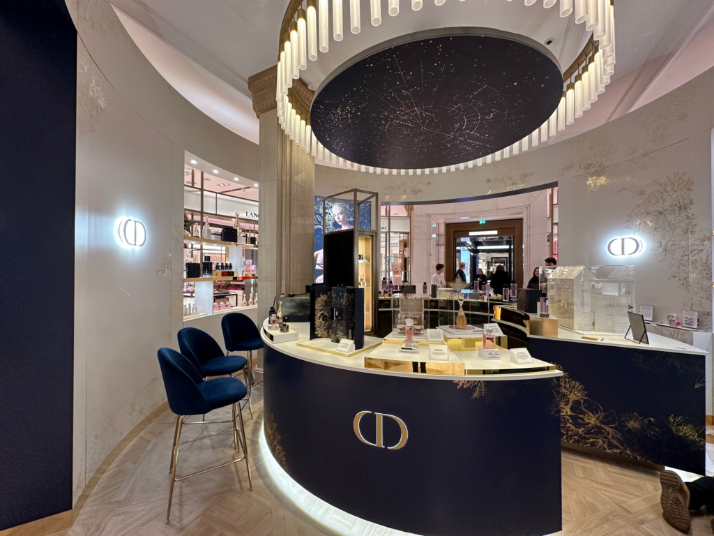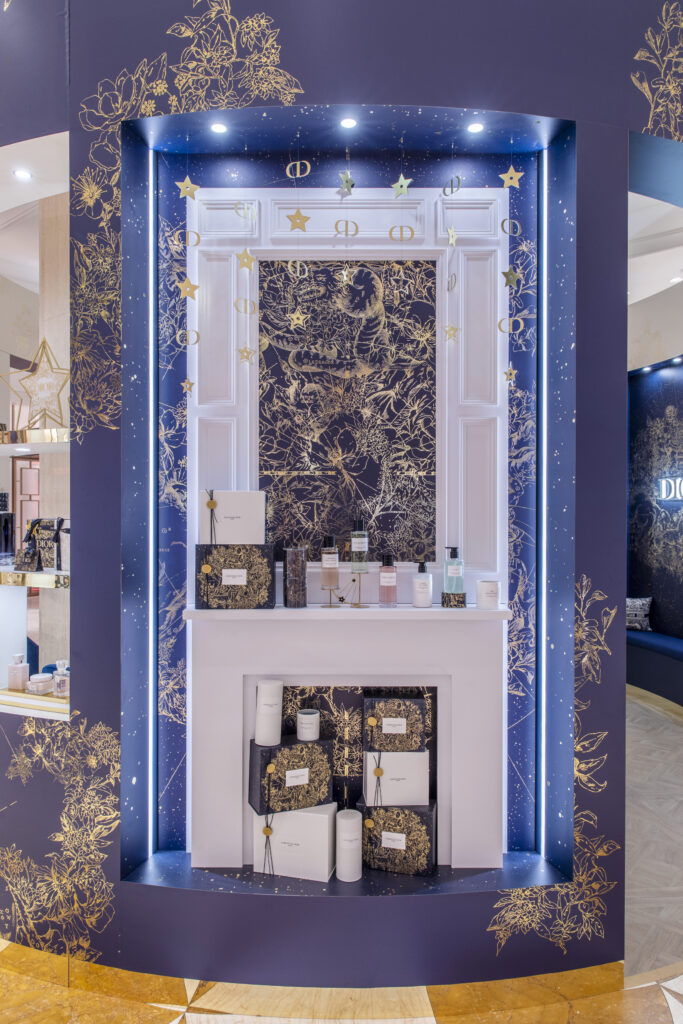 A 360-degree astronomical and floral pattern in mirror gold created an immersive, celestial environment that reflected Dior’s commitment to prestige and meticulous holiday elegance.